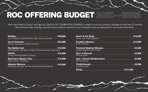 During the ROC month, you will be given the opportunity to be a part of multiplying the kingdom of God through Manna Church. We offer physical and digital options to make your ROC Commitment.